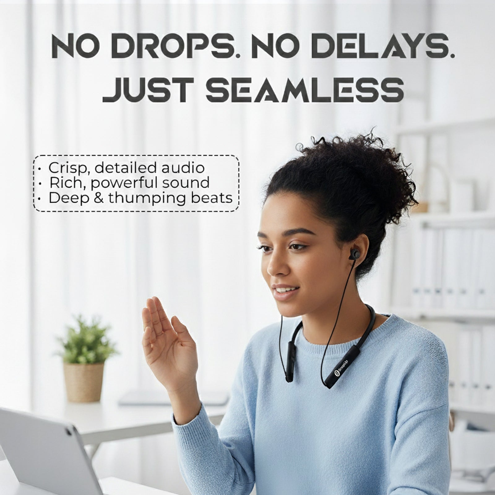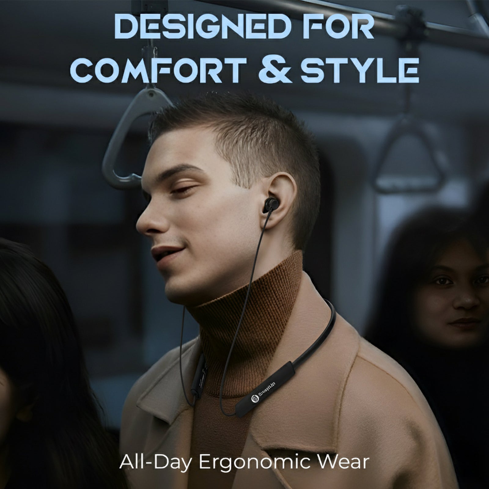 Musique BassX comes with a sleek foldable band that’s easy to carry and designed for long wear. Sturdy build, lightweight feel, and comfort fit make it your go-to neckband for music on the move.