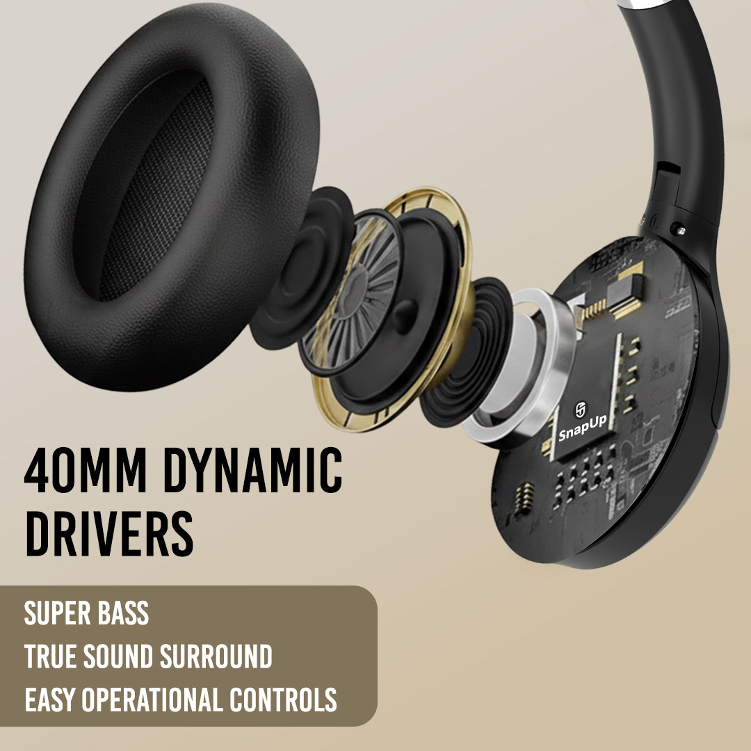 SnapUp Snaphead Glow is equipped with large 40mm dynamic drivers engineered to deliver deep, punchy bass and crystal-clear highs. Whether you're listening to music, watching movies, or gaming, the headset produces a wide soundstage with true surround depth and balanced clarity.