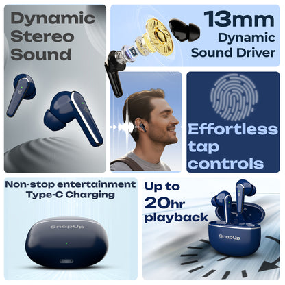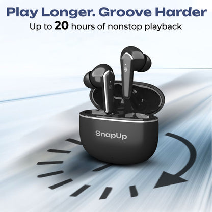 Snapods S512 Ion is your go-to for every Moment - Your Music, Long Meetings, Crisp uninterrupted Voice Clarity. With Snap Sync Bluetooth v6 Ultra - Walk and Talk without connection Lag! Ensuring a powerful bass-driven sound, ENC for calls, and 20H battery backup, it’s designed to keep up with you. Compact, stylish, and loaded with features like seamless touch controls enables you to control your Snapbuds. These Snapods are more than just tech, they’re your lifestyle partner.