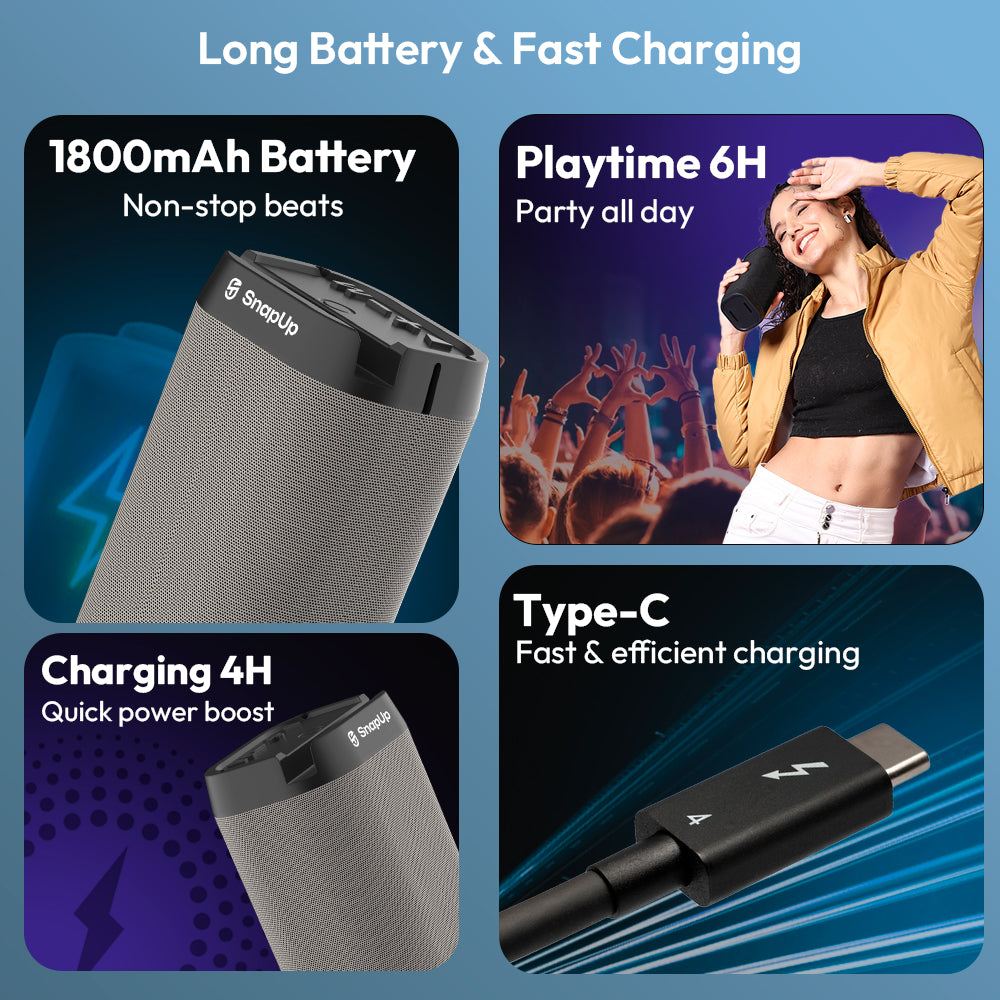 The speaker provides up to 6 hours of playtime on a full charge, depending on volume levels and usage.