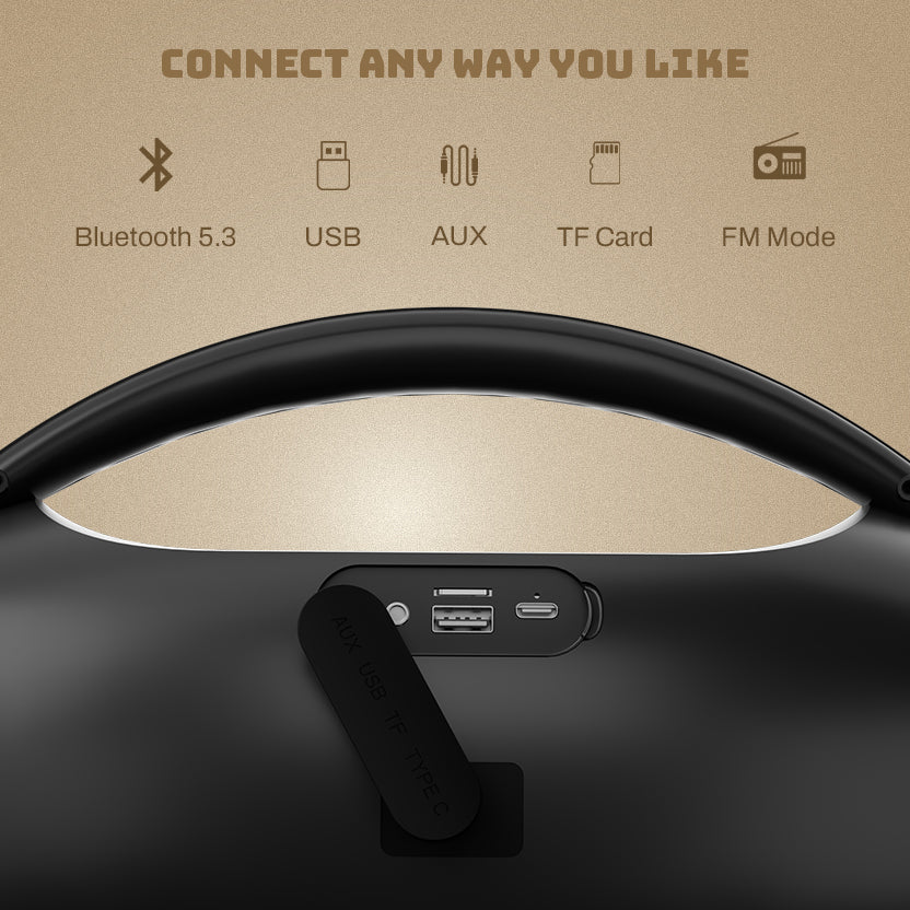 Powered by a massive 77mm speaker driver, it supports TF card, USB read, and AUX connectivity, giving you versatile input options for uninterrupted music. Built with a bold, heavy-duty design and equipped with a convenient carry handle, it combines power with portability for any occasion.