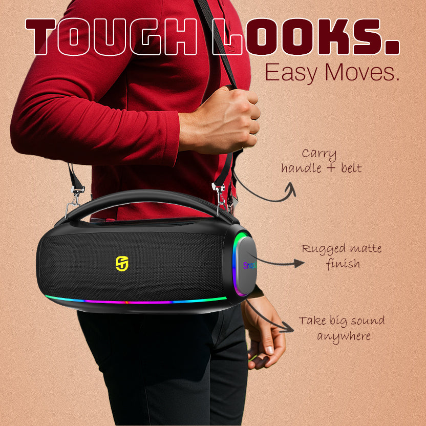 What sets it apart? The smart portability. It features a sturdy carry handle and a detachable shoulder belt, so you can easily carry the party wherever you go whether it’s a terrace night, picnic scene, or house jam. The speaker’s size strikes a perfect balance: big enough to boom, but easy enough to move.