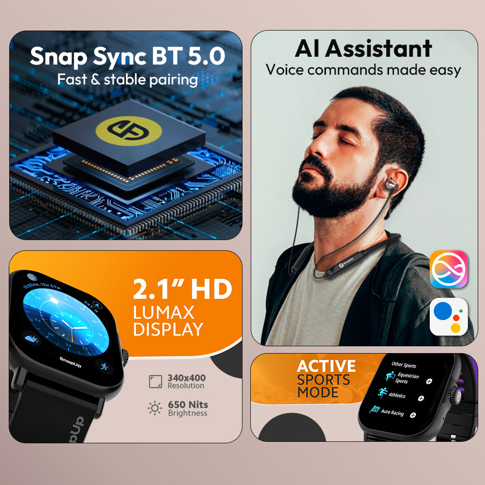 Step up to the ultimate screen experience with a 2.1" HD Lumax Display. Stay connected with smart notifications, track activities with active sports modes, and enjoy a 2.1" HD Lumax display. Customize your watch faces and experience advanced Bluetooth Calling with SnapSync.
