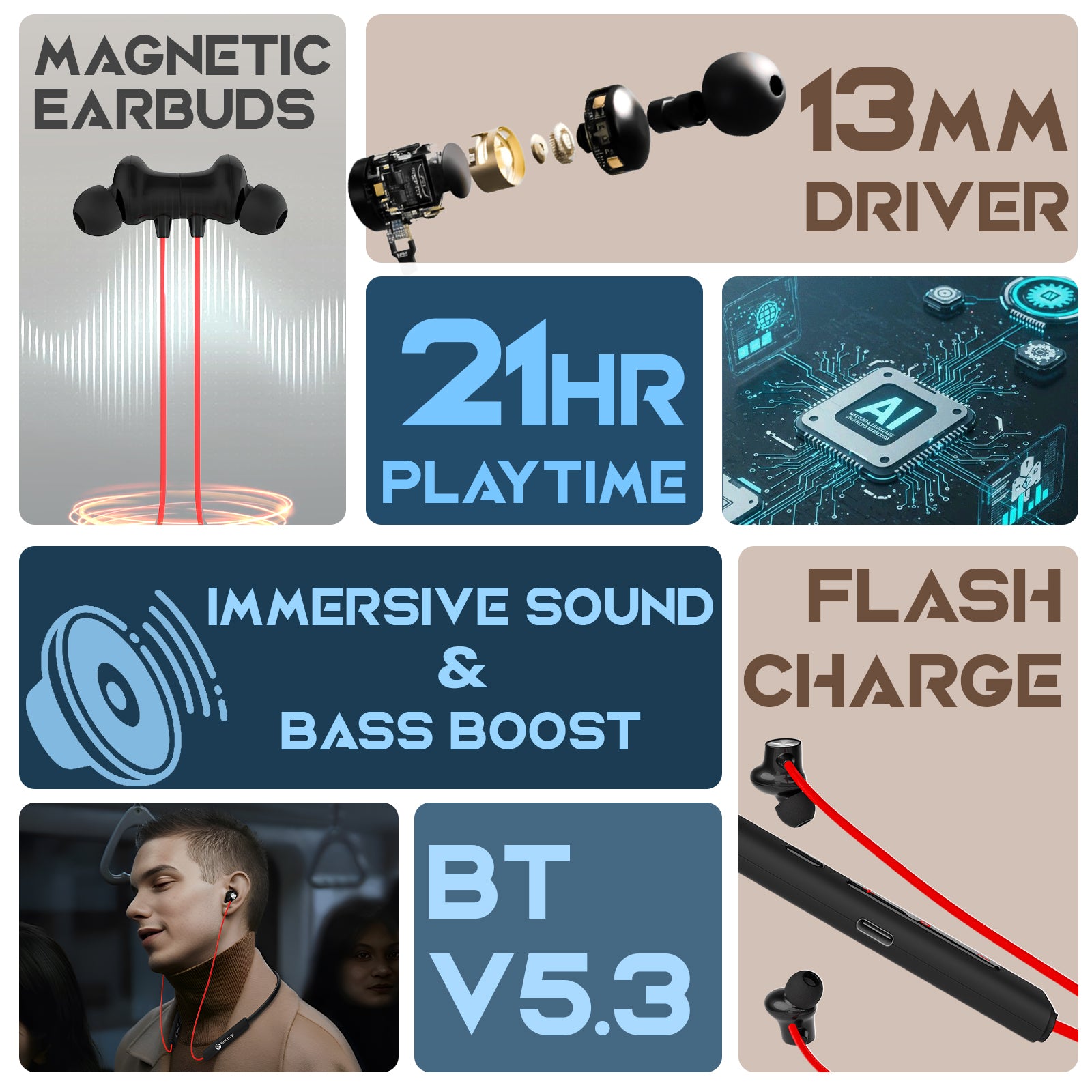 Musique BassX is the perfect blend of bold sound, comfort fit, and portability. With 13mm dynamic drivers, crystal-clear sound, and super bass, it elevates your playlist. The foldable band, magnetic earbuds, and dust resistance ensure real-world durability, while 21 hours of playback keeps you grooving. Flash Charge, dual pairing, and AI support make it more than a neckband, it’s your all-day audio companion.