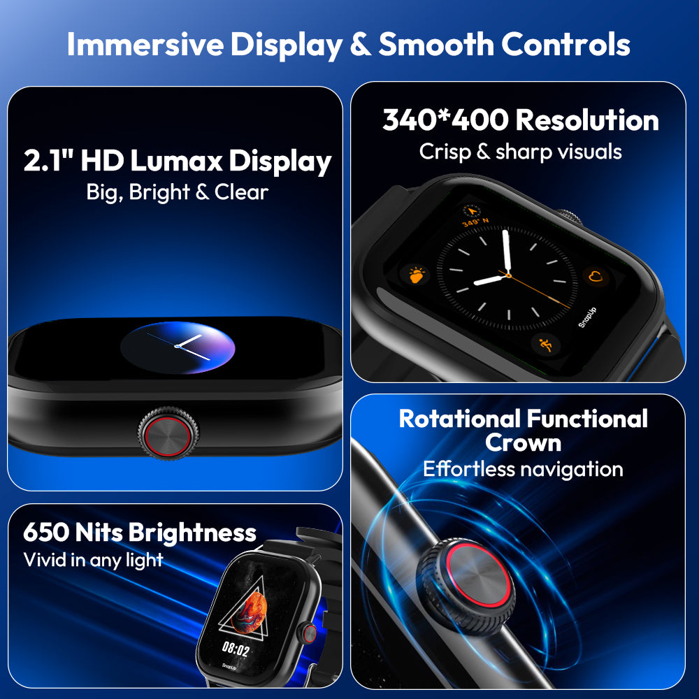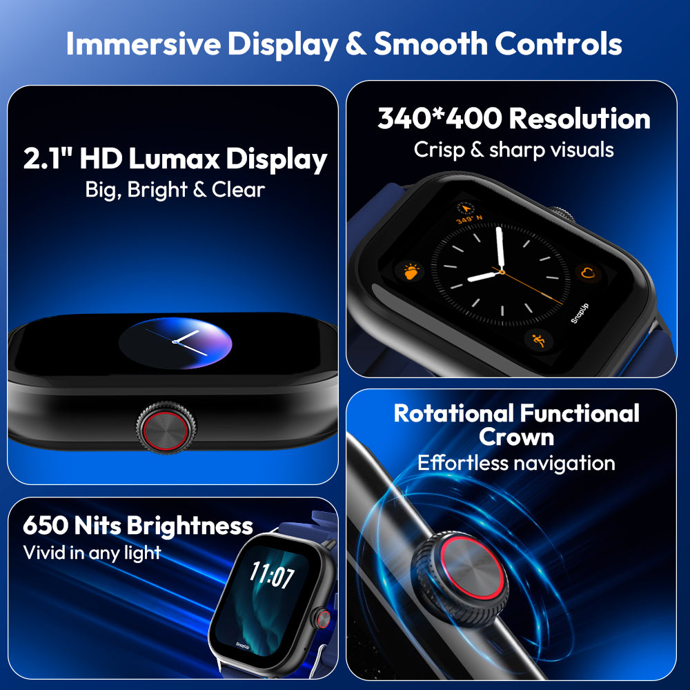 Stay ahead with Horizon Go, a feature-packed smartwatch designed for seamless connectivity and fitness tracking. Its 2.1" HD Lumax Display with 650 nits brightness ensures crystal-clear visibility, while advanced Bluetooth calling, smart notifications, and AI assistant support keep you connected on the go. Track your health with heart rate, SpO2, sleep monitoring, and a female health tracker, and stay active with 100+ sports modes. With a rotational functional crown, customisable watch faces, and up to 3 days of battery life, Horizon Go is built for style, convenience, and performance.