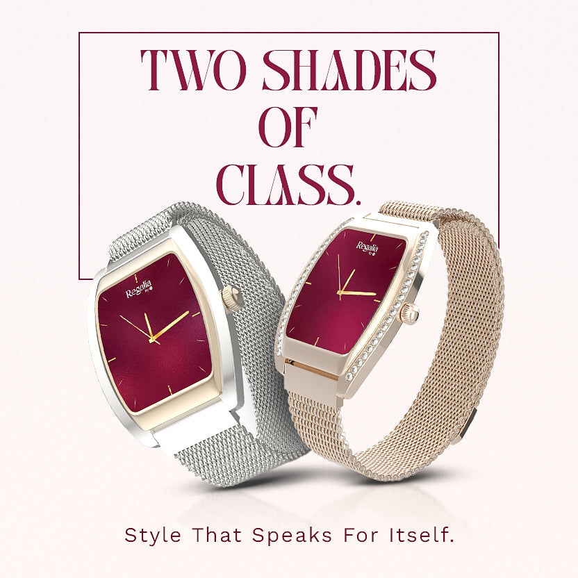 Where refinement meets modern allure. These dual-tone watches combine minimal design with striking detail, featuring deep crimson dials, sleek metallic mesh straps, and a silhouette that speaks quiet confidence. From power-packed meetings to elegant evenings, their subtle shine ensures your style always stands apart.
