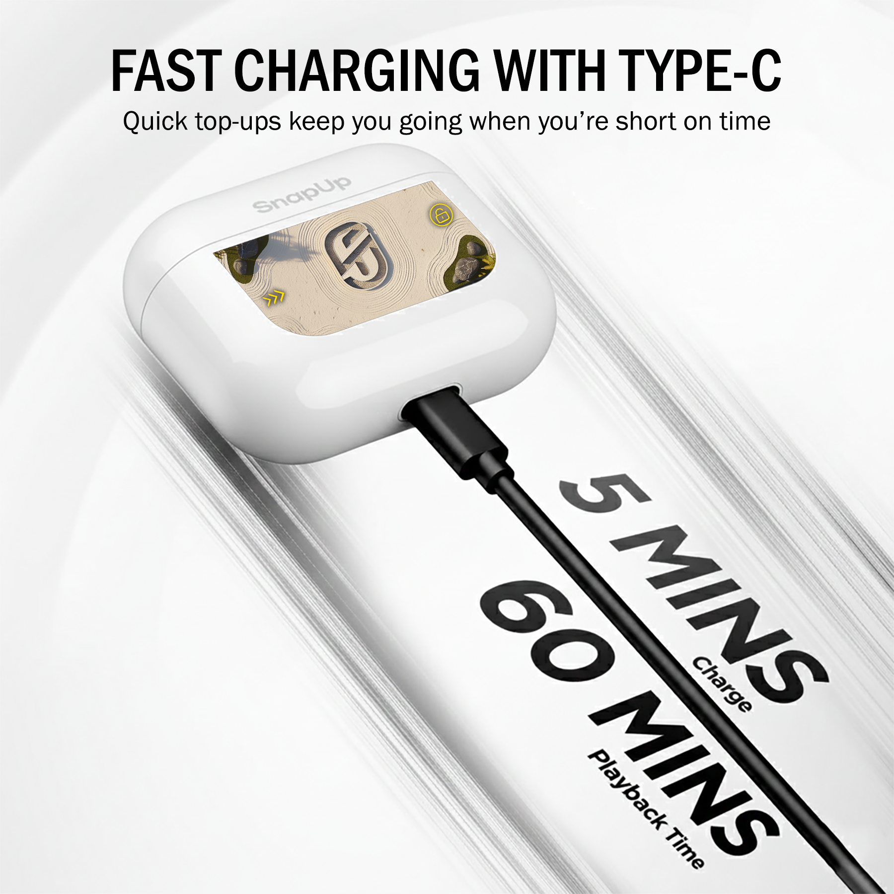 Snapods View is built to keep up with your day, offering up to 20 hours of total playtime for uninterrupted listening. And when you’re in a rush, just 5 minutes of fast charging gives up to 60 minutes of playback, so your music, calls, and gaming never have to wait.