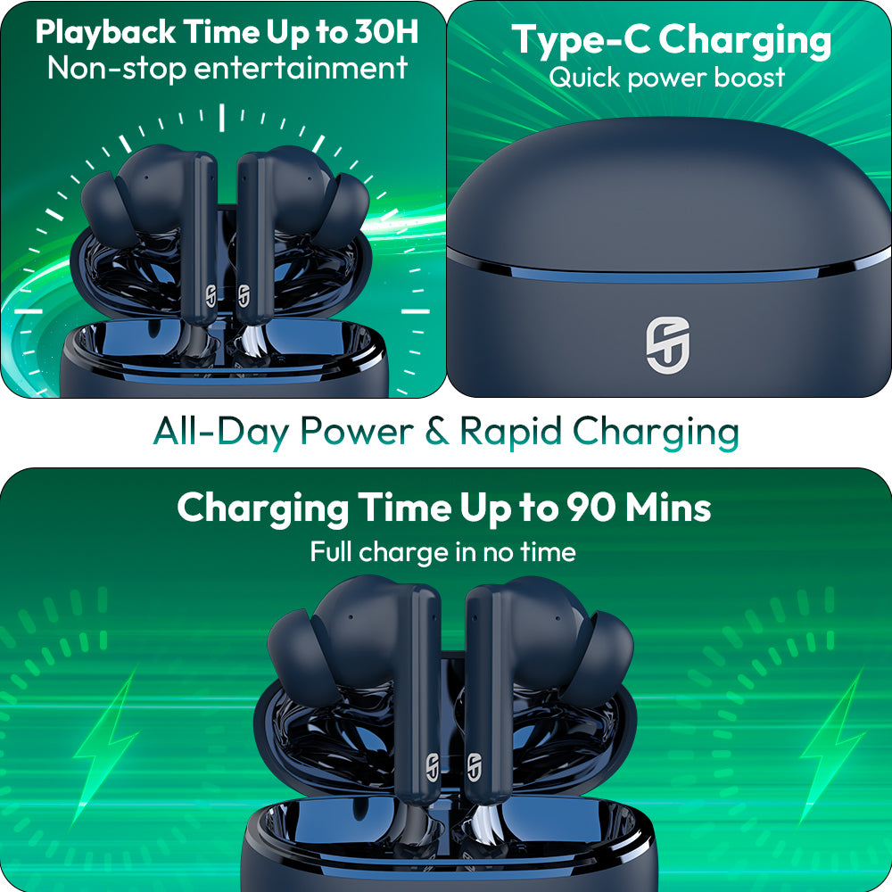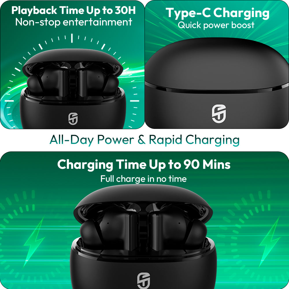 Snapods S511 ION offers up to 30 hours of total playback time with the charging case. A single charge provides extended listening hours, ensuring all-day use.