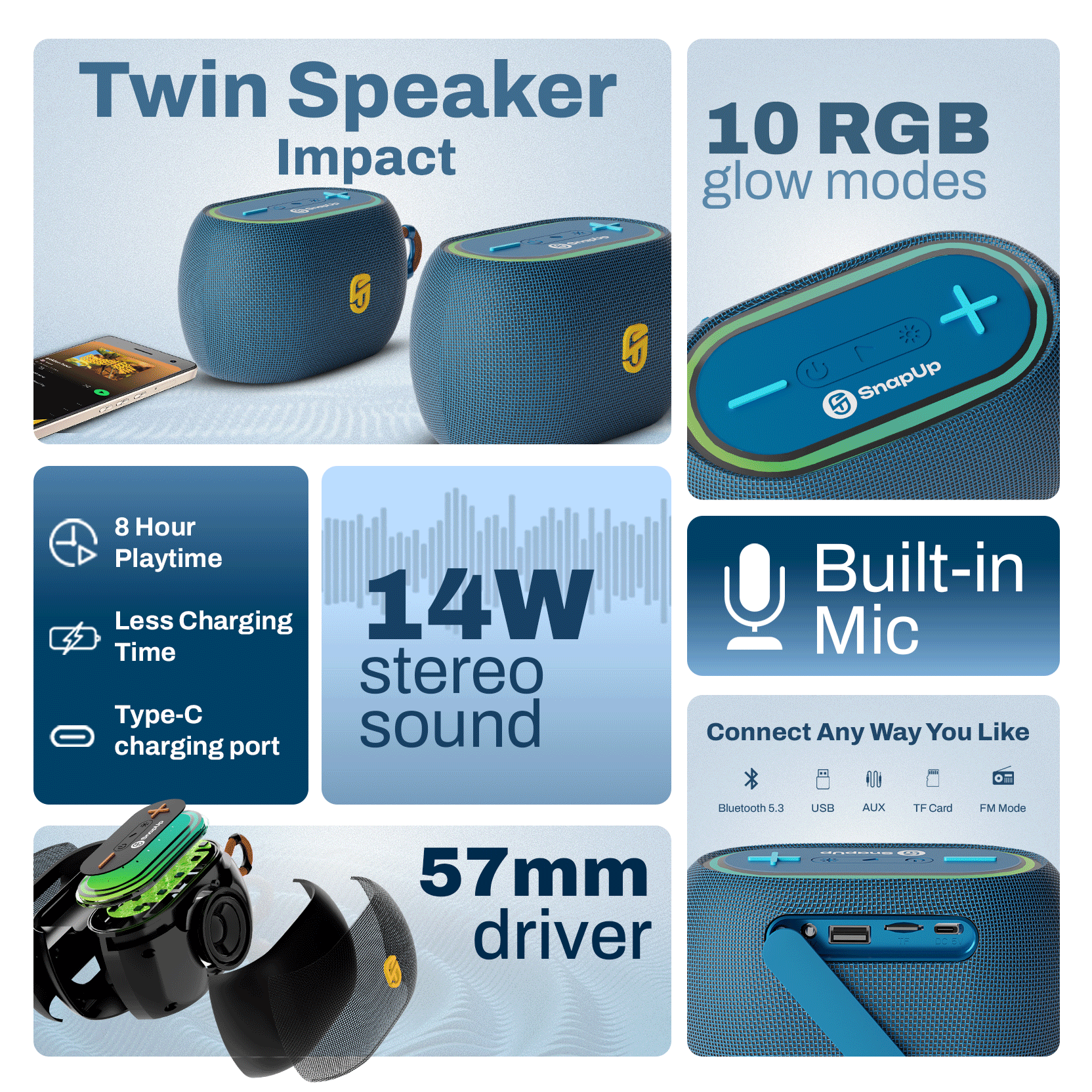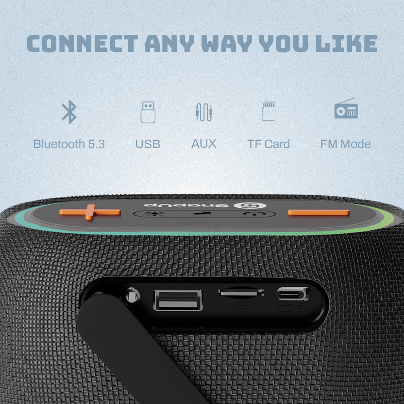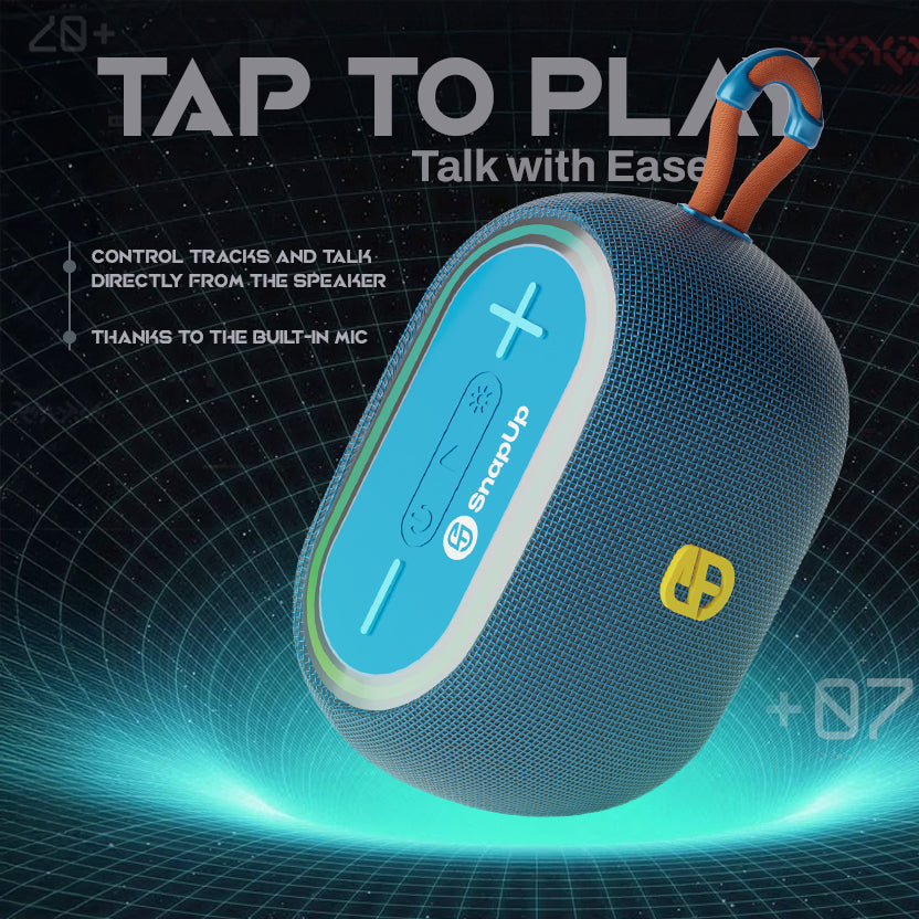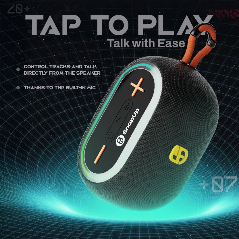 Meet the SnapUp Groove Vibe a compact yet powerful Bluetooth speaker built for your everyday moments. It delivers rich 14W stereo sound through a 57mm driver, backed by Tru HD Bass and acoustic tuning for extra clarity. Whether you're streaming wirelessly over Bluetooth 5.3 or using USB, AUX, TF card, or FM, Groove Vibe keeps you connected to your playlist, your way.