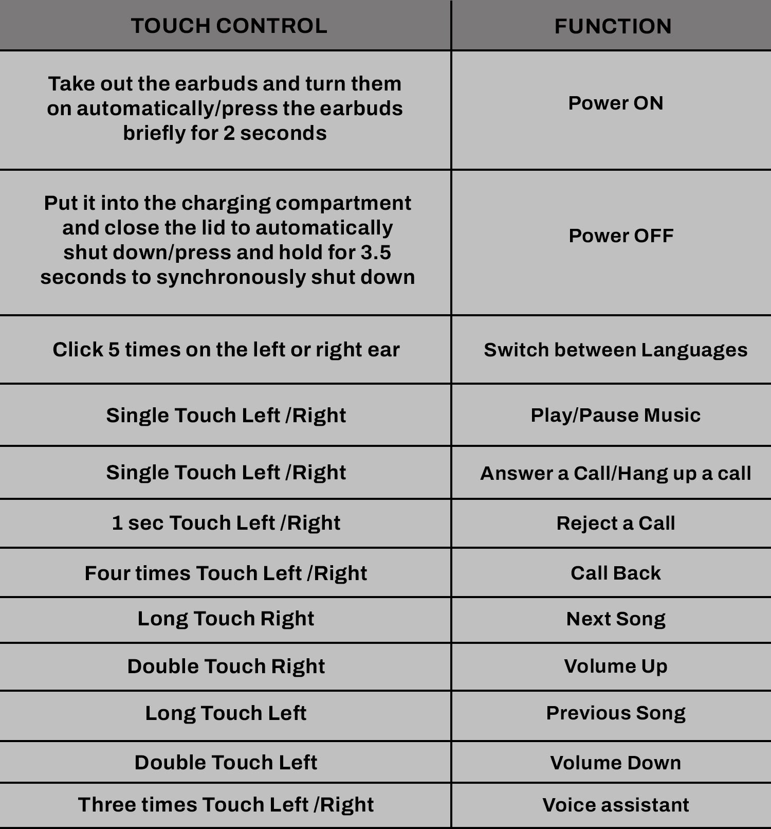 - Answer / End Call: Single tap either earbud.