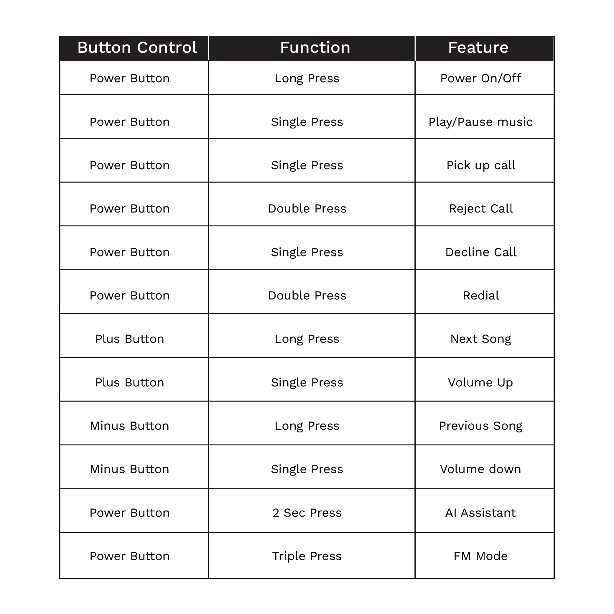 • Control the function of last song/ next song/ Pause/ Play; it needs your mobile phone to support AVRCP. Please refer to the instructions of your BT enabled device’s User Manual for further information.