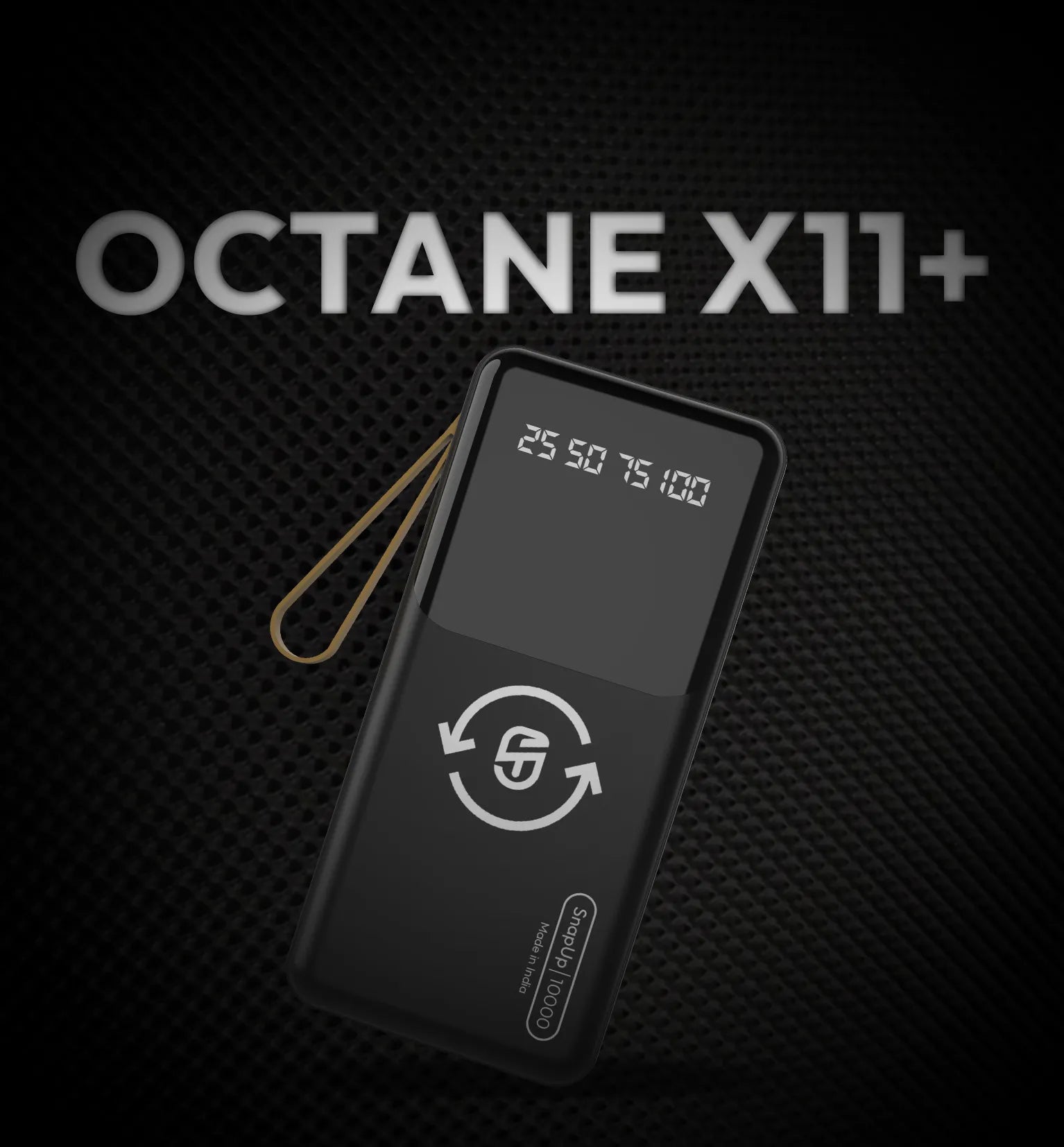 Octane X11+ is the powerbank that can keep your devices running for hours. With a battery capacity of 10000mAh, it can charge your smartphone, tablet, or other USB devices multiple times. It also supports fast charging, so you can get more power in less time. The Octane X11+ powerbank has a sleek and compact design, making it easy to carry around. Whether you need a backup power source for travel, work, or emergencies, the Octane X11+ Powerbank is reliable and convenient choice.