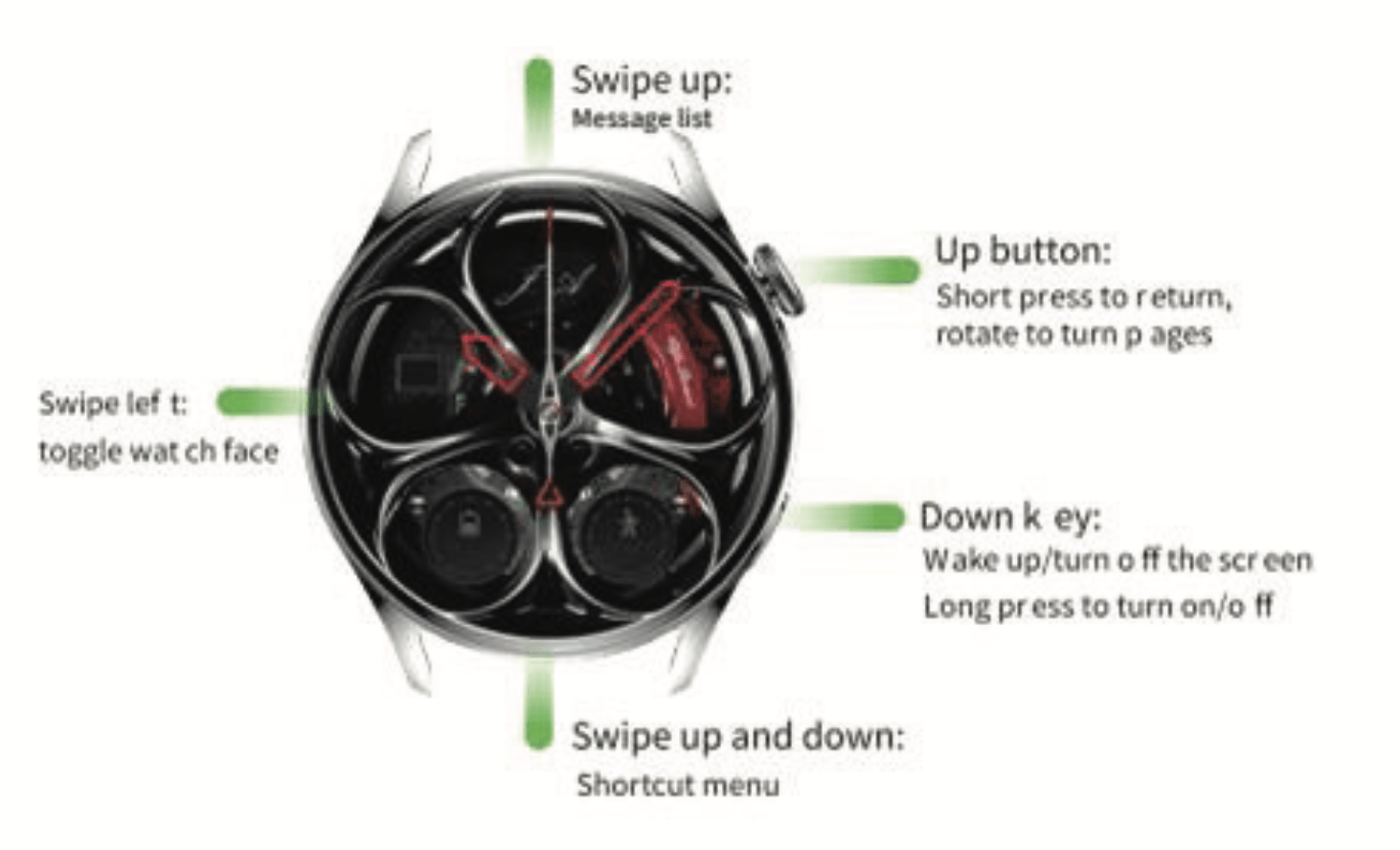 Power button: Up button: short press to return, down button: wake up/off the screen and long press can be used to switch the machine.