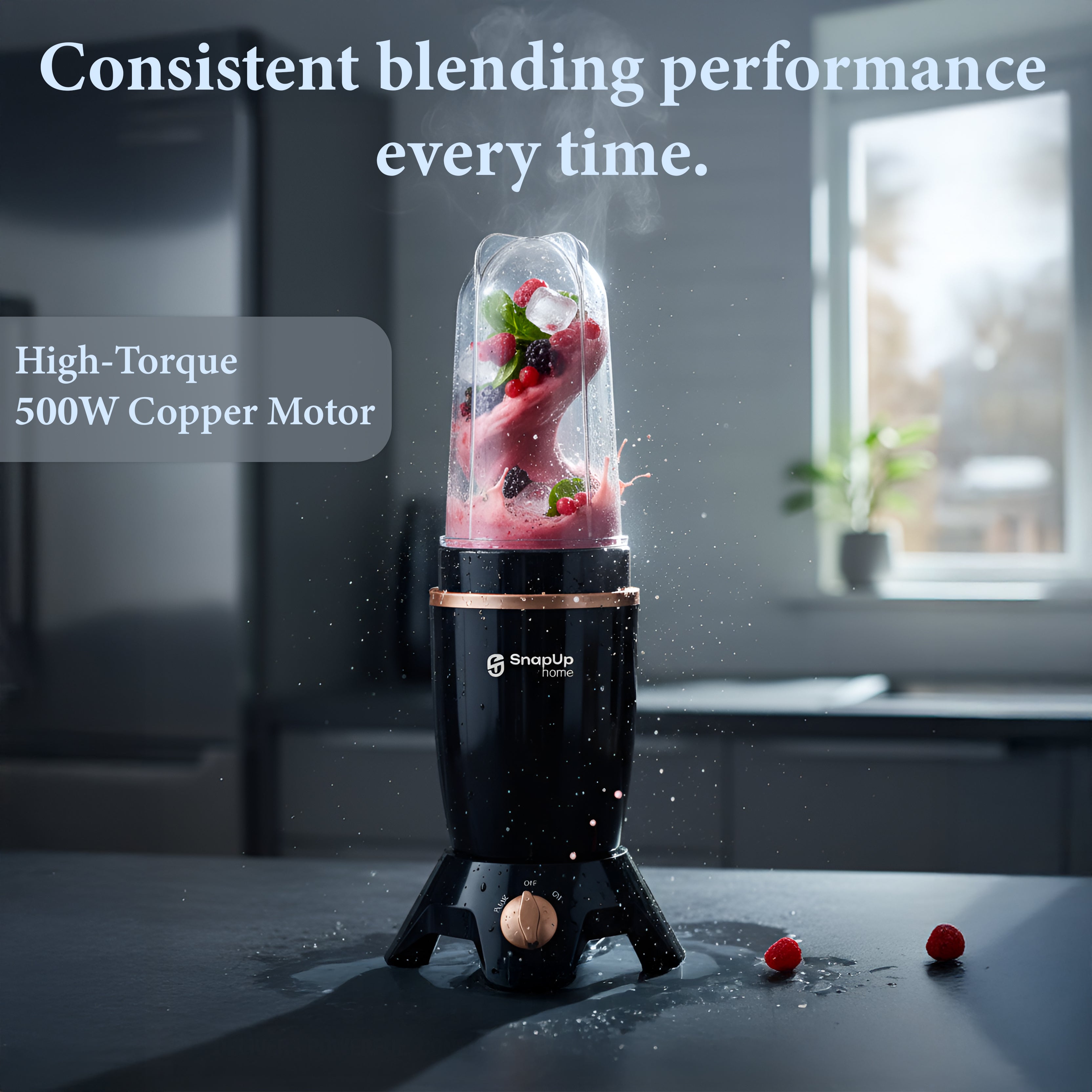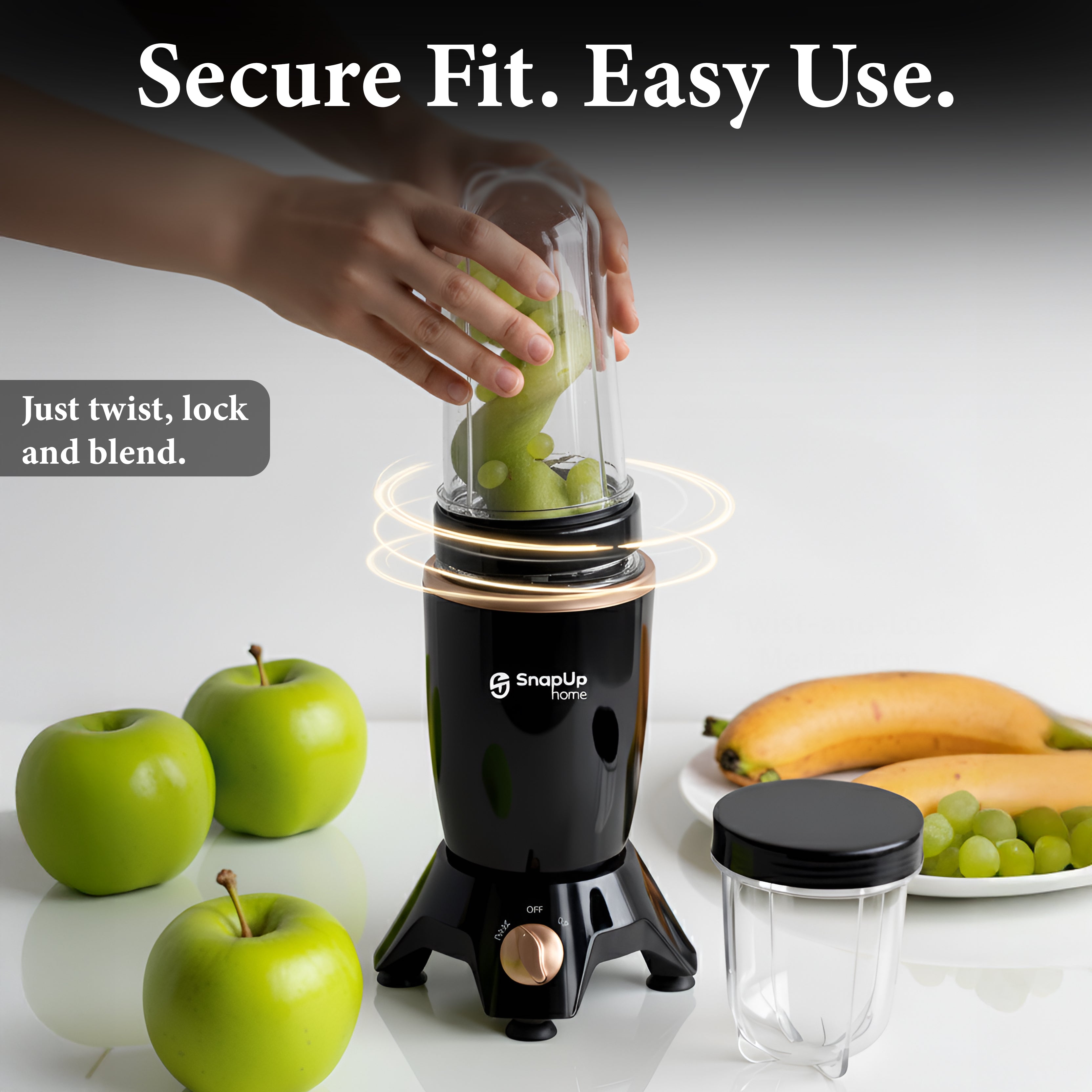 SnapUp Bolt Nutri Blender makes blending fast, effortless, and reliable. With a 300W motor and sharp stainless steel blades, it is your daily companion for smoothies, shakes, and quick preps. Designed for easy use, safe handling, and lasting performance, it is the everyday essential your kitchen deserve