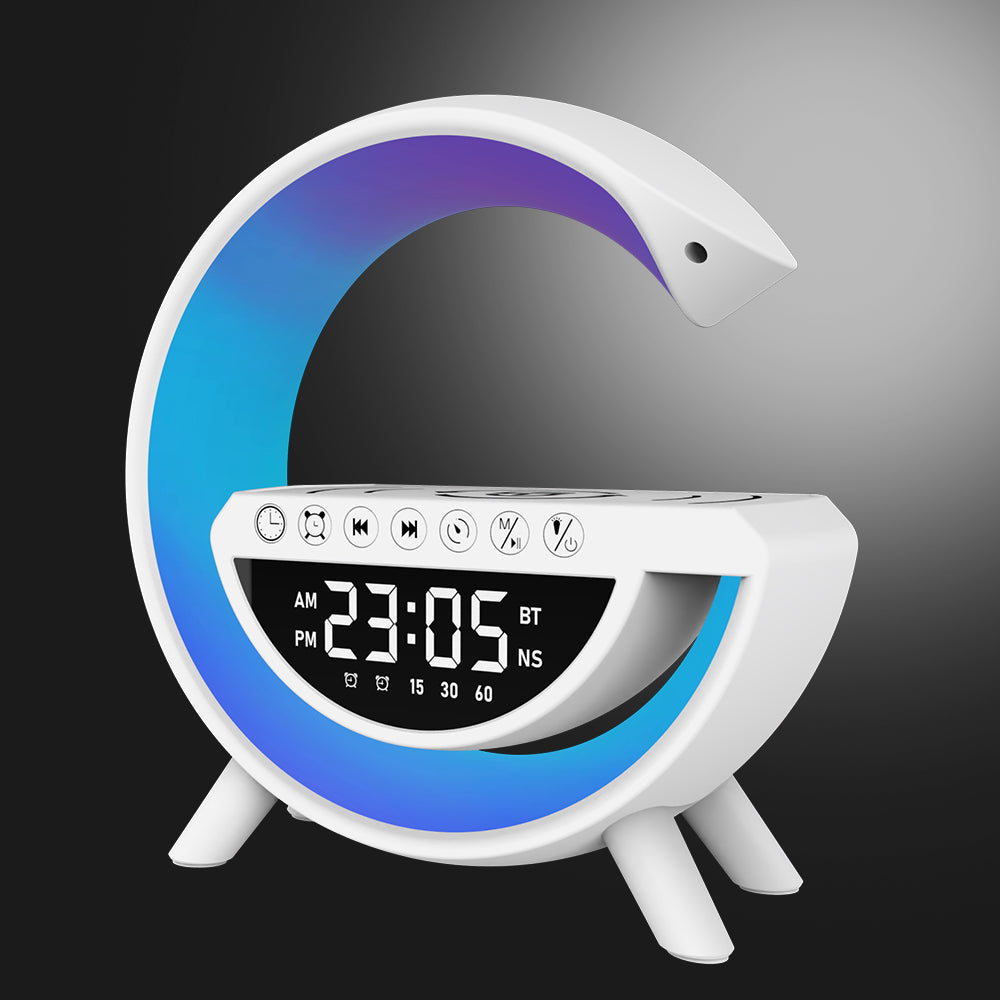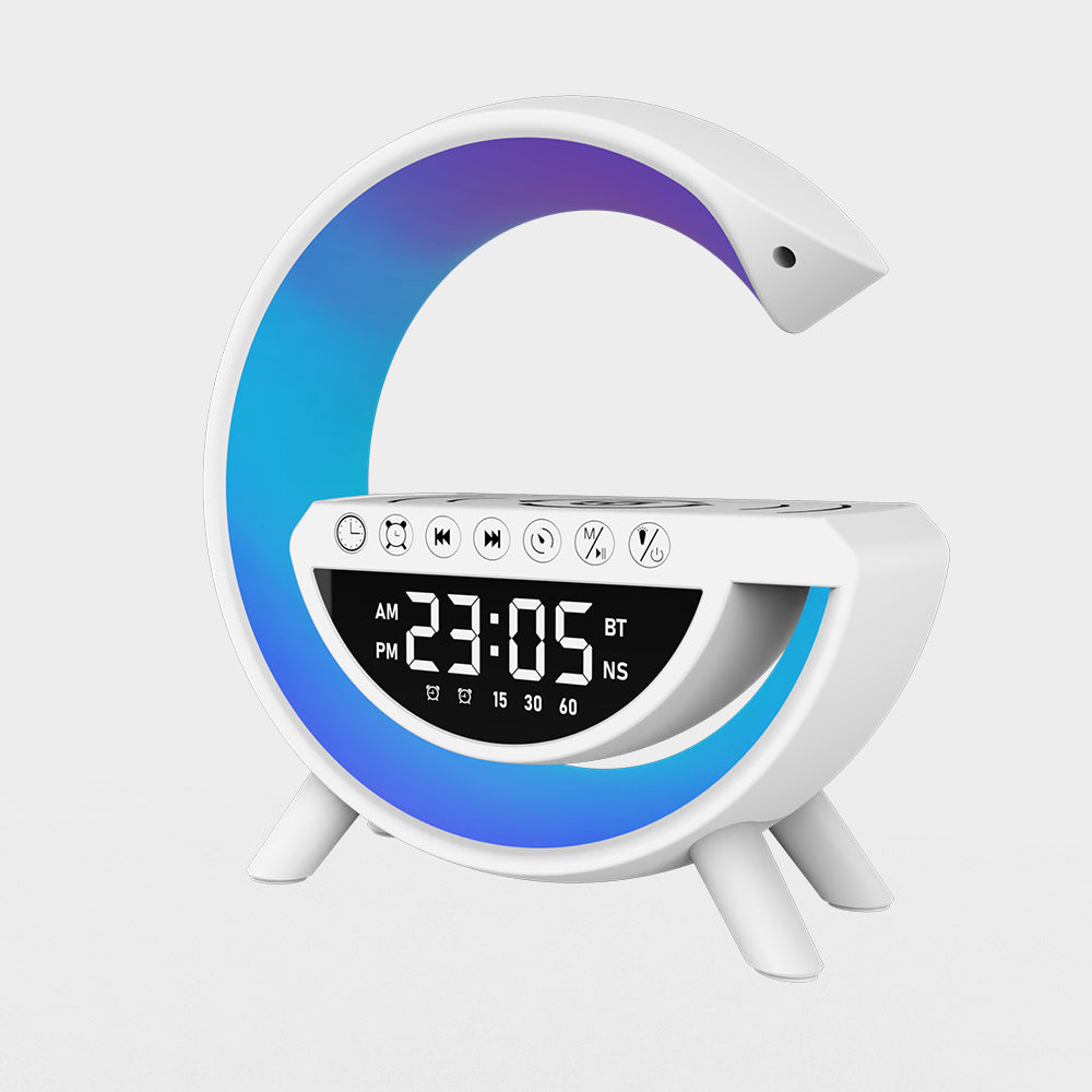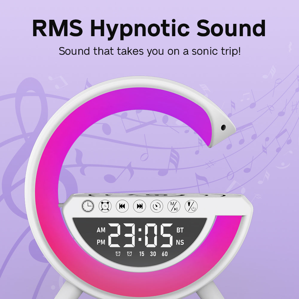 Experience immersive sound with this just white wireless speaker, featuring Bluetooth V5.3 for seamless connectivity. Enjoy versatile playback options with a USB read slot, TF card slot, AUX input, and FM mode. The RGB lights add a dynamic touch, while the super bass and 5W RMS hypnotic sound ensure a powerful audio experience. Equipped with a 1200mAh battery, it offers up to 4 hours of playtime and 5W wireless phone charging. Additional features include an alarm clock, timer, and integrated controls for convenience. Charge effortlessly via Type-C, with a full charge in 5 hours.