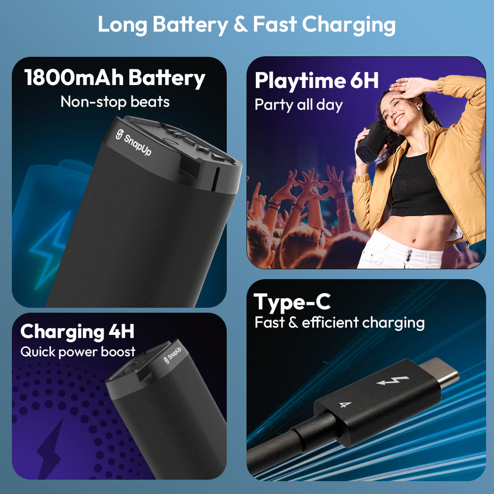 The speaker provides up to 6 hours of playtime on a full charge, depending on volume levels and usage.