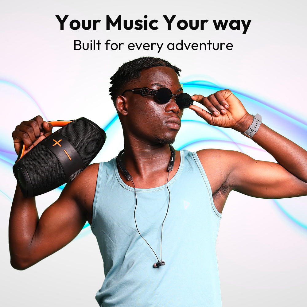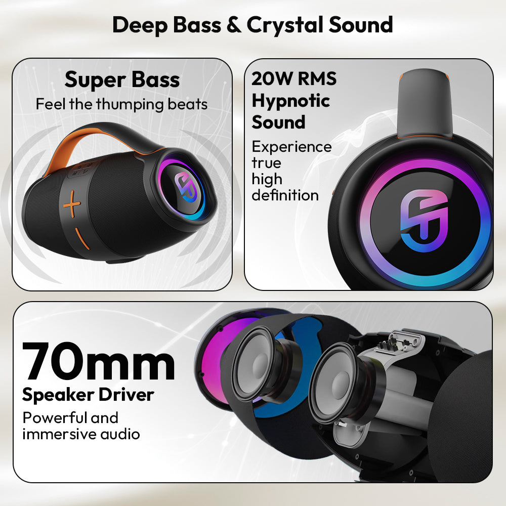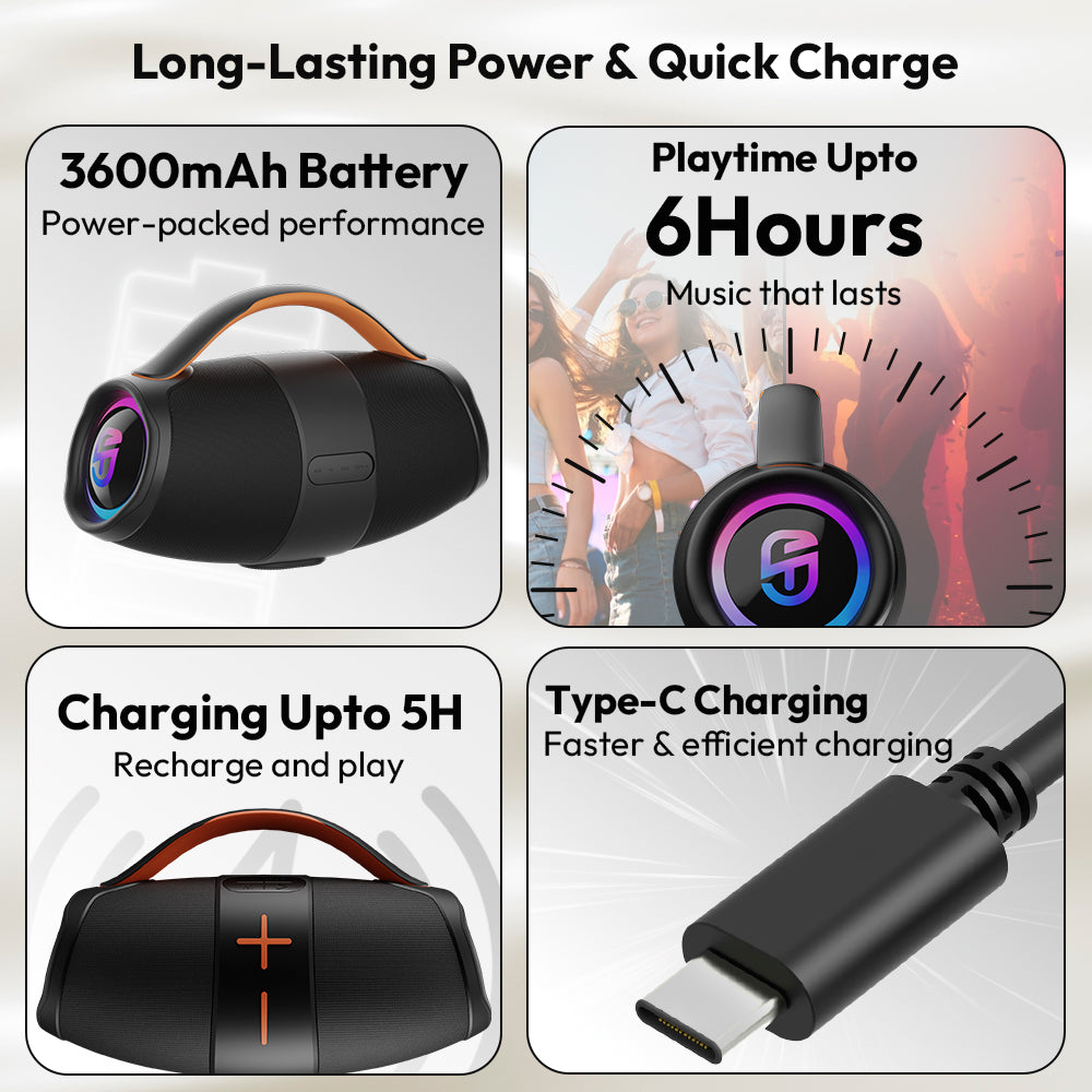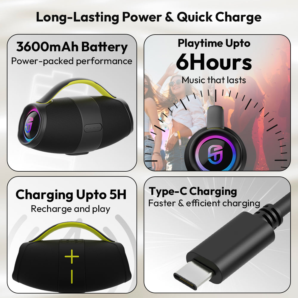 Experience immersive audio with Groove Z, a 20W RMS Bluetooth speaker designed for deep bass and crystal-clear sound. With RGB lights, TWS pairing, and multiple connectivity options, it delivers a dynamic listening experience. A 3600mAh battery ensures up to 6 hours of playtime, while its lightweight design, built-in mic, and hands-free calling add to the convenience. Built for versatility, IPX-rated dust & sweat resistance keeps the music going anywhere.