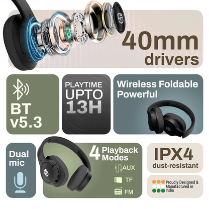Long listening hours feel effortless with Snaphead Vibe. Designed with an adaptive headband, comfort-fit earcups, and a foldable frame, it sits perfectly on your head without the bulk or pressure. Whether you're at work, on the move, or chilling at home, this headphone is made to match your flow. The IPX4 dust resistance keeps it safe against daily wear, while the foldable build slips easily into your bag. You also get easy operational controls placed intuitively for quick volume, play/pause, and mode switches (no more fumbling). With Snaphead Vibe, you don’t just wear a headphone. You wear comfort, control, and confidence.