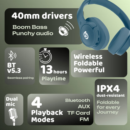Snaphead Vibe is your wireless upgrade for bold, bass-driven audio. Powered by Bluetooth v5.3 with Snap Sync pairing, this foldable headphone is designed for everyday comfort and non-stop listening. Its 40mm dynamic drivers deliver HD immersive sound with Boom Bass, making every beat deeper and richer.