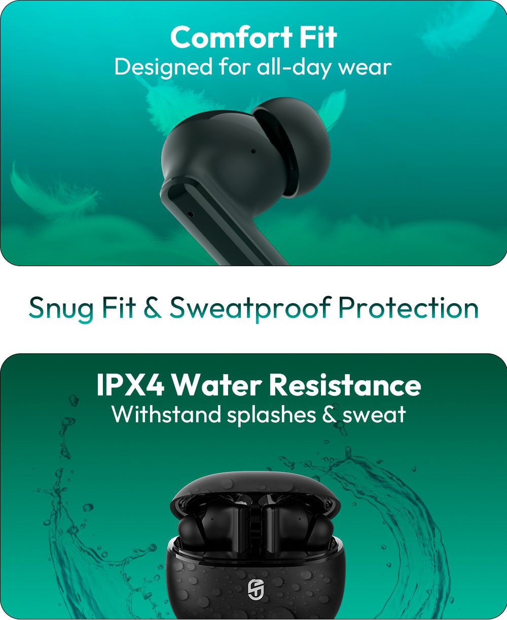 Stay powered with up to 30 hours of playback, fast Type-C charging, and a lightweight, ergonomic fit designed for all-day wear. Low-latency gaming mode and adaptive echo cancellation enhance your experience, while IPX4 water resistance keeps you worry-free.